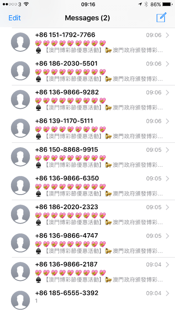 Log of Chinese SMS spam iPhone messages Chinese SMS spam iPhone message