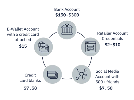The third stage of the attack occurs once the attacker has successfully extracted the desired credentials from the mobile user. This is valuable information which the attacker then seeks to sell on the dark web. The value varies depending on the type of information the attacker possesses. Below are some examples – specific to North America – of different credentials and what they can be worth on the black market, starting out at $7.50 for a social media account with five hundred or more followers and rising to $300 for an individual’s bank account details.